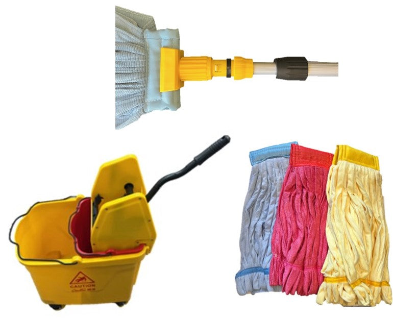 Includes: 2 x Extension Claw Handles, 35qt down press w/ dirty water bucket, 20 yellow tube mops